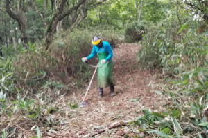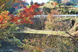 さらに、上の道路のガードレールに絡みついたクズや法面の雑草や灌木を取り除いてみると、下から美しい石垣が現れました。 以前から、石垣は古人の血と汗と涙の結晶に思えて、いつも尊敬の念を抱いてしまいます。それに芸術的でもあります。