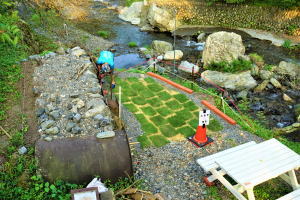 下山後、皆さんはクールダウンの体操で身体をほぐします。そして、我々はその間にピザ釜に火を入れて、ピザの準備をして、焼き始めます。 一度に3枚は焼けます。数分で焼き上がります。そして、熱々を参加者の皆さんから食べてもらいます。昨日は、暖かかったので、 成木川に面した屋外のテラスで食べてもらいました。皆さんも大満足の様子でした。そして、ピザの味に関しても、なかなかの高評価でした。