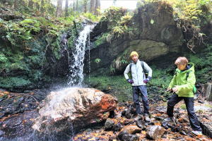 途中で座禅の滝に下りて、綺麗な水の滝壺で手を浸されていました。また、滝の裏の壁にカワガラスの巣を 見つけました。