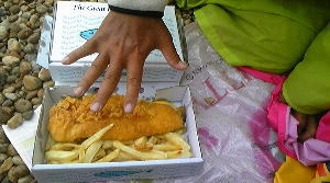 15時から21時までの海練習は何度か雨が降り、ずぶ濡れになるので「3時間泳いだら私だけ帰ろうか」と思っていた。ところが18時30分にフィッシュ& チップス(写真)が夜食で届くと聞き、そう簡単には帰れずに、雨の中、ボランティアに専念した。