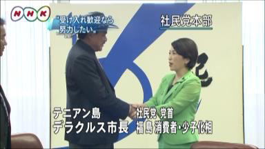 昨日(26日)、テニアン市長レーモン・デラクルズと社民党党首福島が拍手するシーンがNHKニュースで流れた。 レーモンのトレードマークである カーボーイハットがいつもの小汚いものと違って、ピカピカの高級そうなものだったのにレーモンのやる気と緊張感を読みとることができた。