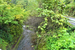 そこには太い梅の木が対岸に1本づつ、2本あり、久しく手入れされていないため、下枝のほとんどが枯れ、白化が進んで、成木川に垂れ下がっています。景観が良くない。さらにつる植物のクズがネットのように木全体に覆いかぶさっています。まるでお化けの様です。 これとは別に少し下流にもクズがネットのように覆いかぶさった樹木の塊があり、内部にある木の種類さえ判別できません。 取り除いてみると、すっかり元気がなくなったケヤキとモミジでした。