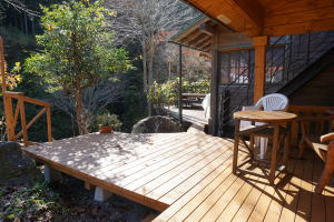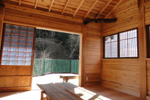 そんな折、大西の一言があり、「大西ならば、KFCならば、その建物を地域のために活かしてくれるのでないか」という思いで、地域の人たち総出で、直ちに古民家の改修工事が始まりました。この時、大西は当初の設計にはなかった無理なお願いを一つしました。それは裏手のテラス(ウッドデッキ)の 増設です。オープンエアーのテラスは周囲の山や川、それに空気を直に感じることができる非日常のスペースとなるからです。自然豊かな成木にあっては、それがこの建物には必須と感じていました。