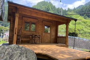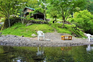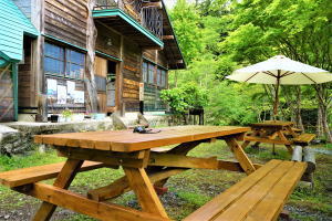 先ずは2020年5月に入り、手のつけ易い敷地内の草刈りや伸び放題のモミジの木の剪定から始めました。翌6月に入って、川沿いの屋外スペースにピクニックテーブルを設置しました。コロナとの共存社会を考え、訪れる人に新鮮な空気と共に山と川を身近に感じることができる心地よい屋外スペースが欲しかったからです。
