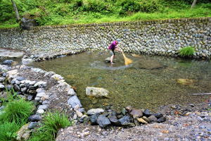 夏、水の恋しい季節になって、河原の整備清掃を始めました。地元成木育ちで、この辺りの川を遊び場にして育った市川さんが担当しました。先ずは、河原に生い茂っている雑草や川底にある陶器や金属片等々の除去から始めました。せっかくの清流なので清潔で安全な場所に整備し、我々昭和生まれの大人がかつて体験したような楽しい川遊びを近所の子供達にも体験してもらいたいと思ったからです。