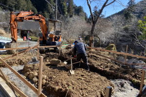 それを傍で見ていた井田さんが「つぶす時はどうすんだよ!」と突っ込みを入れていたのが笑えました。そんな井田さんはその敷地に覆い被さっていた邪魔な太い桜の木をチェーンソーで切り倒し、処理してくれました。また、加藤さんは気を効かせて、依頼された基礎工事だけでなく、工事で出た石や土砂を利用して、敷地周りに石垣を組んで整地してくれました。それも含めて基礎工事は5日間で完了しました。因みに、加藤さんは12年前に「成木の家」の基礎工事もやっています。