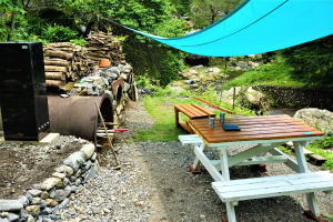 そして、次は裏手の川縁に密集する背丈ほどのイタドリの雑草場をやっつけることにしました。雑草のなかでもイタドリは強敵です。その土中にほとんどが埋まった状態になっていたかつての炭焼き窯があり、それを掘り出しました。ドラム缶ほどの窯が3つも出て来ました。そして、それを有効利用できなかと思い、少し手を加えてピザ焼き窯に改造しました。さらにその付近の川縁スペースを整地し、ピクニックテーブルを置いて、その場で焼き立てのピザが食べられるようにしました。