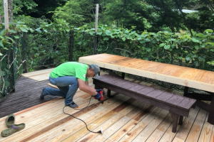 ウッドデッキの補修に関して、床板を全部はがして張り替えると云うのは我々素人の身の丈を超えています。よって、今ある傷んだ床板の上から新たに板を打ちつける方法を選択しました。これなら素人の日曜大工でもできると思ったからです。それにコスト的にも楽です。近所に住む陶芸家上泉さんが電動工具を貸してくれ、さらに手伝ってくれました。