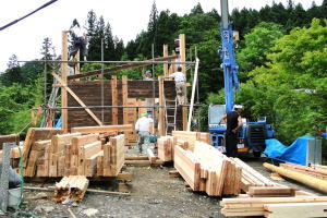 次に、角ログを組む大工仕事です。これまた近所の武藤(武藤建築)さんにお願いしました。幸い武藤さんは過去にログハウスを組んだ経験が多くあったのでスムーズに組み上がりました。それでも周囲に足場を組んだりし、ログ専用の工具を用意したりで、大工さん2人で10日間ほどかかりました。やはり自分たちで組まなくてよかったと思いました。成木の場合、これくらいの建前は近所のマンパワーだけであっという間に完結します。成木の底力です。
