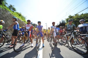 第二ウェーブにも女子のオリンピック選手で国内第一人者である片山梨絵選手やMt.富士山ヒルクライムの優勝者で ある金子広美選手、それに、高橋香世選手などのエリート選手が参加、トライアスロンからは佐藤浩巳選手と岡いずみ選 手の参加がありました。