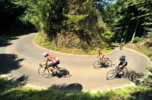 そんな中、黙々とこいで行く選手、笑顔で声援に応える選手、カメラを向けるとVサインをする選手などなど。1人 1人の息づかいが聞こえてきます。緑の森の中、いろんな色のジャージが途切れることなく長い列を作っていく様子は、 見応えのある風景です。
