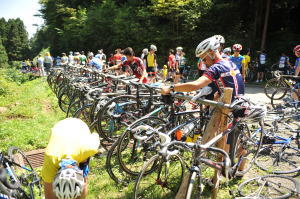 8時頃になるとどんどん参加者が受付にやってきます。自走で来た選手も多く、既に一汗かいて到着。中には道を間違え軍畑の 方まで行ってしまい、二山越えてギリギリ到着したタフな選手もいました。受付会場には元トライアスリートの宮塚さんの ブースも登場、いろいろなバイクグッズが並び盛況の様子。