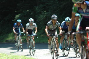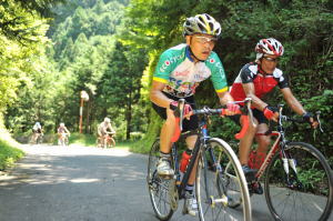 頂上では、スイカのサービスがあった。嬉しい!!!スイカを食べて、栄養補給。参加者の全員が登ったので、下山。 下りはゆっくりと集団で走る。そして、勝負の第2ステージに備える。