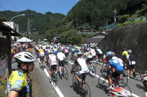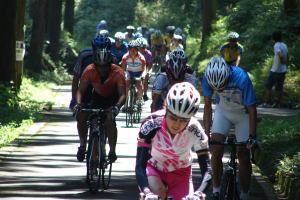 出だしの1キロくらいは緩やかで、ヒルクライムとはいえ、かなりのスピードが出せるところ。いきなりのスタート ダッシュで、案の定出遅れた私は、あっという間においていかれ、先頭は視界から消えてしまいました。もう駆け引き などなく、自分のペースでいけるところまで追い込んで、苦しくなった後半は、ただ我慢で耐える作戦。