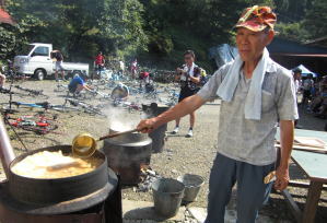当初は、例年のように皆さんへのお土産用にジャガイモを400kgほど用意する予定にしていました。ところが、 今年の長雨でジャガイモの出来がイマイチ、その為、400kgも集めることが不可能ということが分かってきました。 そこで、豚汁を作って、ジャガイモを始めとする成木の野菜を皆さんに食べてもらうことにしたわけです。