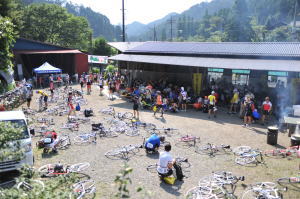 会場は、例年通り、成木の森林組合(里仁会)の中島さんの広い庭先をお借りしています。もともと製材所であったため、 成木らしい木の椅子やテーブルなど、大会にあつらえたような装具がたくさん。さらに今年はお手製のバイクラックや表 彰式用の台も作って下さいました。