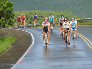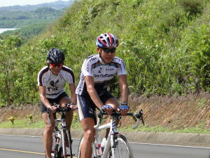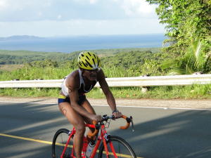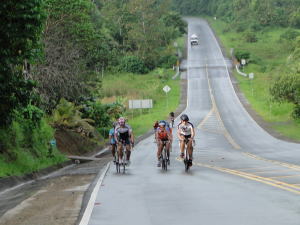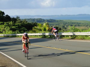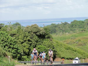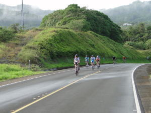 さて、ビーチランでアップが完了、という感じの参加者のみなさん。さっそくバイクパートに入って行きましたが、このパラオの大会は、バイクもランも かなりダイナミックなコースなんです。丘陵がずっと続く、という状態なので上って降りてまた上って、の繰り返し。参加者のみなさんもだんだんと表情が 真剣に。でも国内ではなかなか体験できそうにないロケーションに感動も強かったと思います。
