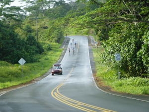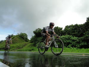 12月6日(日)のパラオ島民期待の「第1回パラオ・シェル・レインボー・タイムトライアル100km」が開催された。運悪くバベルダオブ島南部のスタート 地点辺りは雨だった。しかし、これから向かう島中部や北部は晴れているという情報が入っていた。熱帯特有のスコールのため時々激しいスコールが降っていた。