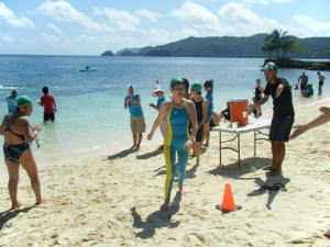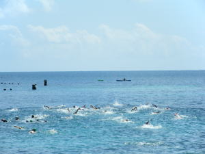 今年はパラオパシフィックリゾートのビーチが西風の影響で利用をストップしたため、オーシャンスイムの会場も東側に変更しました。 こちらは反対側なので風とクラゲの影響もなく安心して泳げます。800mで折り返しの1マイルコース、3マイルの人は3周回です、すごい! 水温はばっちりで、水着で気持ち良く泳げます。パラオパシフィックリゾートほどではないものの、こちらでもコーラルフィッシュなどを 眺めつつのスイムが楽しめます。