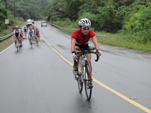 コースは想像の通り、アップダウンがほとんどのドラマティックコース。ロングライドはしばらくしていなかった私には、「完走できるかな?」と不安な面も ありましたが、松丸選手はじめ、引っ張ってくれる数名の参加者がいてくれたおかげで、前半はとても良いペースで走れました。やはりバイクは孤立せず、良い ペースの人についていくことで速く走れるようです。
