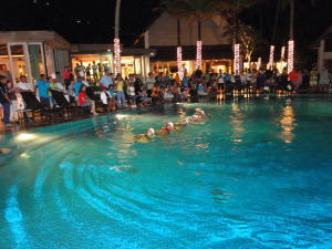 そして、パーティが終わりに近づいた頃、サプライズな演出があった。地元パラオ水泳チームの子供達によるシンクロナイズド ・スイミングがホテルのプールを使って披露された。