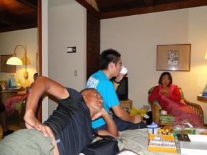 パーティの後、いつのもようにKFCの部屋に気心の知れた友人たちが集まって来た。松丸選手、”ファンライド”の村山編集長、カメラマンのジェロさん、“トライアスロン・ トリップ”誌の編集長の謝さん、高橋希代子さん、それにミュージシャンの二ロさんという面々だ。すべてのイベントが滞りなく終わったという安堵感の中、 いつもの雑談が始まった。