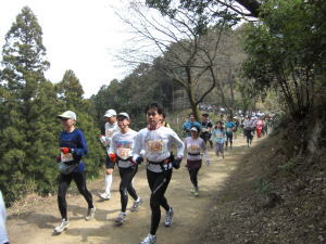 「こんな坂、生活苦に比べれば、たいしたことないぞう!」 その迫力に思わず噴出す。笑える応援というのは、無駄な力が抜けていいもんだなぁ。 その後、「あと6キロ!」の声がかかる。ところがそれからが長い。なかなか道幅の広いハイキングコースに出ない。「あと3キロ!」の声 の頃だろうか。やっとハイキングコースに出て一安心。右下方向には、青梅の町や、桜の木がチラホラと見えてくる。気持ちのいいトレイ ルロードだ。すでに歩いているランナーやストレッチのために立ち止まったランナーを横目に見ながら、ひたすらゴールを目指した。