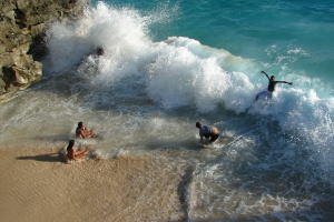 6月7日(日)、昨日にスイムが出来なかった為、競技は無理でもせめて“ファンスイム&水中写真撮影会”だけでも・・・と試みた。しかし、少しず つ波がおさまってきているものの、まだ十分ではない。ローカルの子供たちは楽しそうに波打ち際で遊んでいた。しかし、よっぽど“海”で泳ぎなれて いないと、危険な状態だ。そんな訳でファンスイム&水中撮影会も中止した。その後、スイムに自信のある選手だけ、海に飛び込んだりして遊んでいた。 今年の第10回テニアン大会は不完全燃焼に終わった。