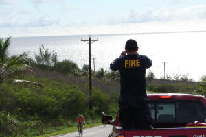 レースまでのこの1週間、島は子供から大人まで、文字通りトライアスロン一色になる。もちろん、キックオフ・ミーティング以前からも 準備は行われているが、本気でエンジンがかかるのはキックオフミーティングからだ。テニアンの場合、コース上草を刈ってから、小石等を エアーブローで掃き掃除をする。その後、日本では絶対有り得ないことだが、消防車を出動させ、その水で路面を全部“洗う!”のだ。これも 私達が要請したわけではないが、“日本からのお客さんに安全に楽しく過ごしてもらう為”その一心からでた、“チャモロ・ホスピタリティー” だ。