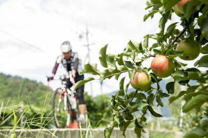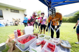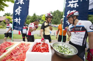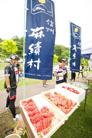 これで皆さんの期待を裏切ることなく、コースから北アルプスを望むことができ、爽やかな避暑地のグランフォンドを堪能してもらうことが できるというものです。エイドではモモ自家製の天然酵母パン、ハーブティ、スイカ、トマトなどの夏野菜が並べられていました。