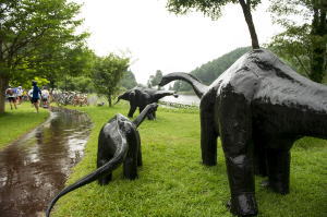 大会に向け聖湖畔に設置した恐竜たち。普段は優しい雰囲気なんですが、この時ばかりは雨で黒光りし、背後の霧と相まって、 かなりリアルに見えました。恐竜の設置は1年前に聖湖を見た瞬間、聖湖には恐竜が良く似合うと思ったからです。