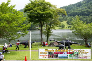 これら3体の恐竜は、大会の1週間前に製作者の西田さんが浜松市で開催中の恐竜展から引き揚げ、運んで来たものです。そして、 現場で待機していた我々(原・市川・斎藤・大西)と麻績村観光課の皆さんとで会場となる聖湖畔にセットしたものです。