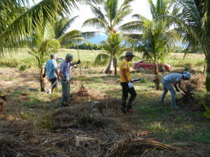 彼らのお蔭で、我々が到着した時にはコーヒー農園予定地はすでに重機が入っており、その土地一面を覆っていたサトウキビの 様に大きいススキの親分は根こそぎ削り取られていました。運よく、役所が近くの道路を工事をしていたので、 その重機を持ってやったのでしょう。