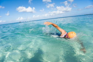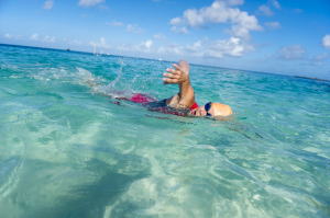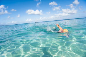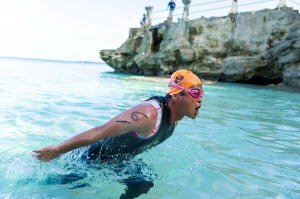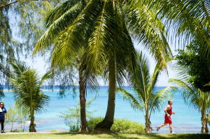 スタート時間が7時半と云うのは、南の島の大会ではかなり遅い方です。では、何故、そんなに遅い時間に設定したのかと云いますと、 日本の 選手の皆さんにターコイズブルーを体験してもらいたいからです。タガビーチの地形の関係からスイムコースに朝日が差し込み始めるのが7時半から なんです。