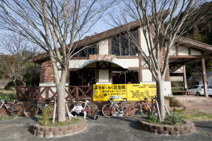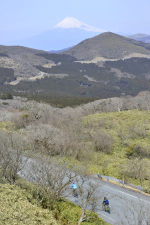 正面の海上に浮かぶ 富士山を望みながら、アップダウンを繰り返し、西伊豆町に入ります。道端には所々、桜が咲いています。 西伊豆町宇久須から激坂を上り 西天城高原にある「牧場の家」へ到着します。ここで美味しいカレーとコーラで体力回復させ、 一気に湯が島温泉の下田街道へ下ります。