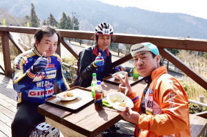 さらに標高約900mにある西天城高原へのヒルクライムです。高原からは眼下に広がる青い駿河湾と雪を頂いた 南アルプス連峰を望むことができます。また、 本ルートの最高地点である仁科峠からは真正面にド〜ンと富士山が 見える・・・はずだったのですが、今年はうっすらと山頂の部分が浮き上がっているだけでした。