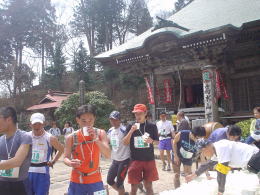 しかし、それを住職の清水さんに話すと、「境内を折返し地点に使ってもいいよ。」と。 やはり、駐車場より本堂正面の境内の方が雰囲気も断然いい。 ここまで頑張ってきた選手も喜ぶ。 それならばと、記念に高水山常福院のお守りを一人ひとりの首に掛けて歓迎するという演出をすることにした。